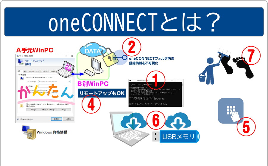 ①A手元WinPCにて、B別WinPCへのリモートデスクトップ接続を 安全/簡単 にするキット②登録情報は不可視化③登録上限数15個(登録内容変更可)④リモートアップ接続もOK⑤PINナンバーで接続⑥コピー可(キットはフォルダ形式) PC本体/USBメモリ⑦A手元WinPC履歴残さず