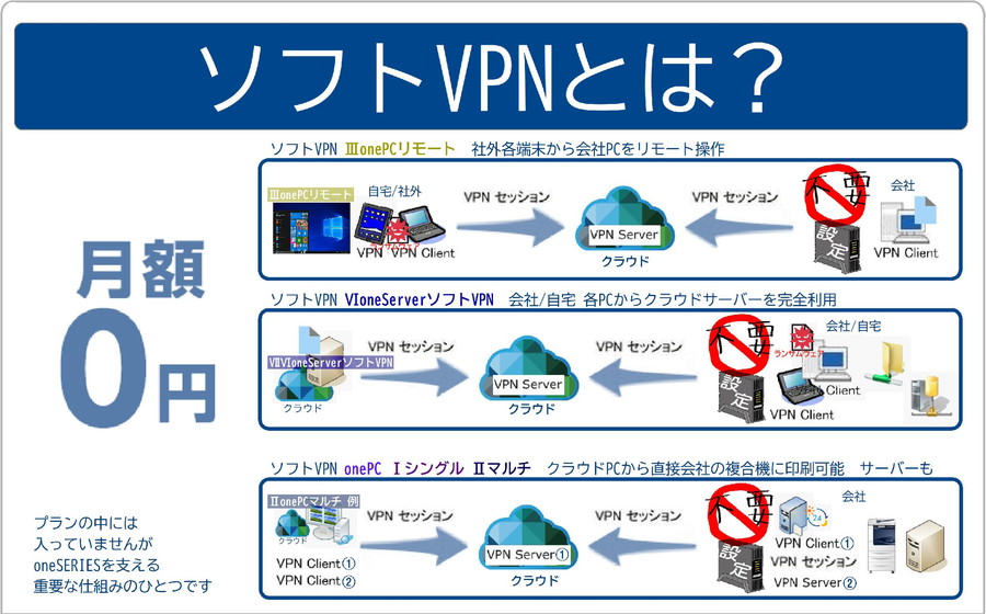 7プラン ⅠonePCシングル ⅡonePCマルチ ⅢonePCリモート ⅣoneSoft ⅤoneSYSTEM ⅥoneServerソフトVPN ⅦoneServer 3タイプ 一<パソコン>タイプ 二<ソフトウェア>タイプ 三<サーバー>タイプ