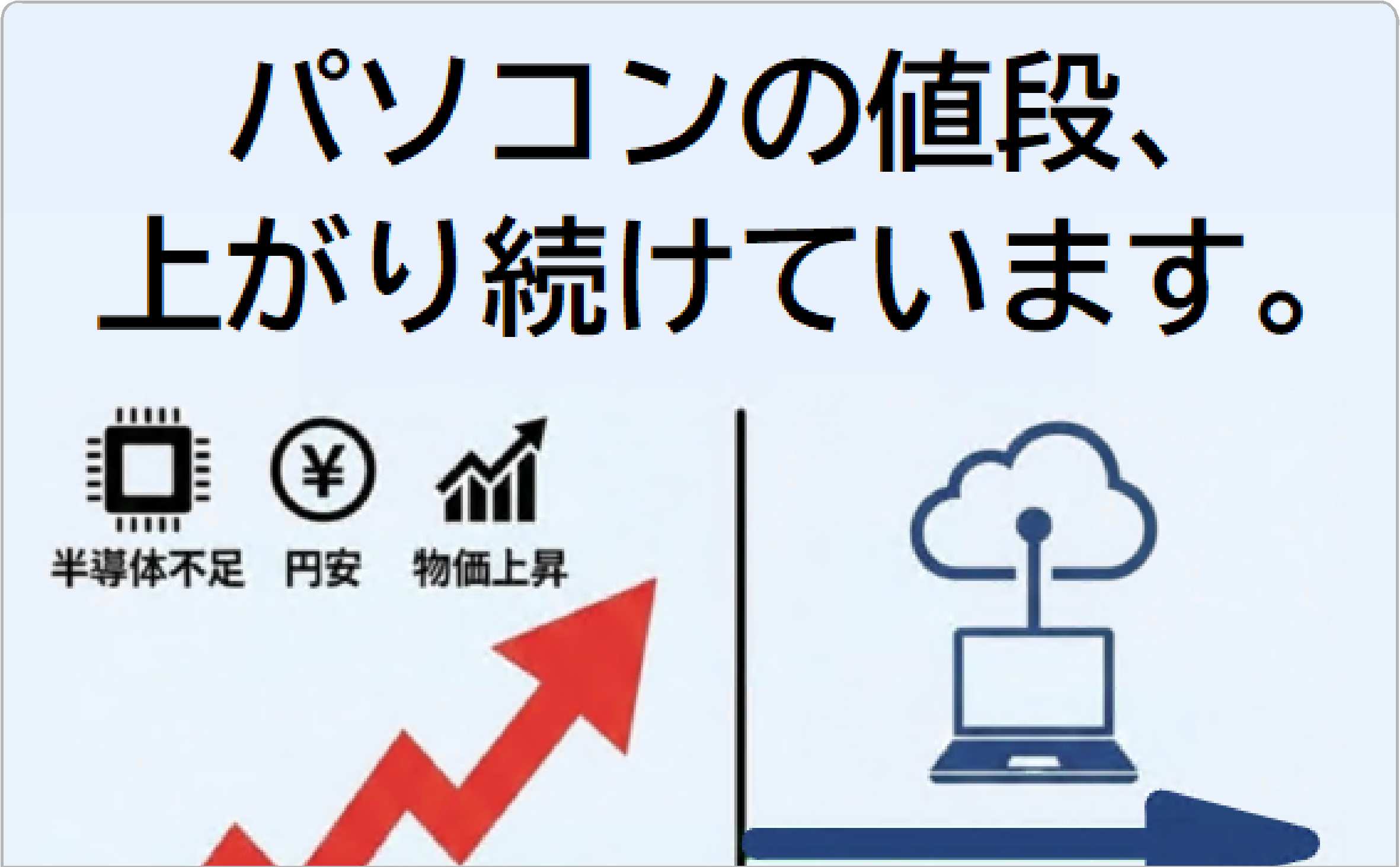 パソコンの値段、上がり続けています。 半導体不足、円安、物価上昇。PCは今後も値上がりが続くと予測されています。 ①1台10万円が当たり前 ②3年ごとに入れ替え ③故障すれば仕事が止まる