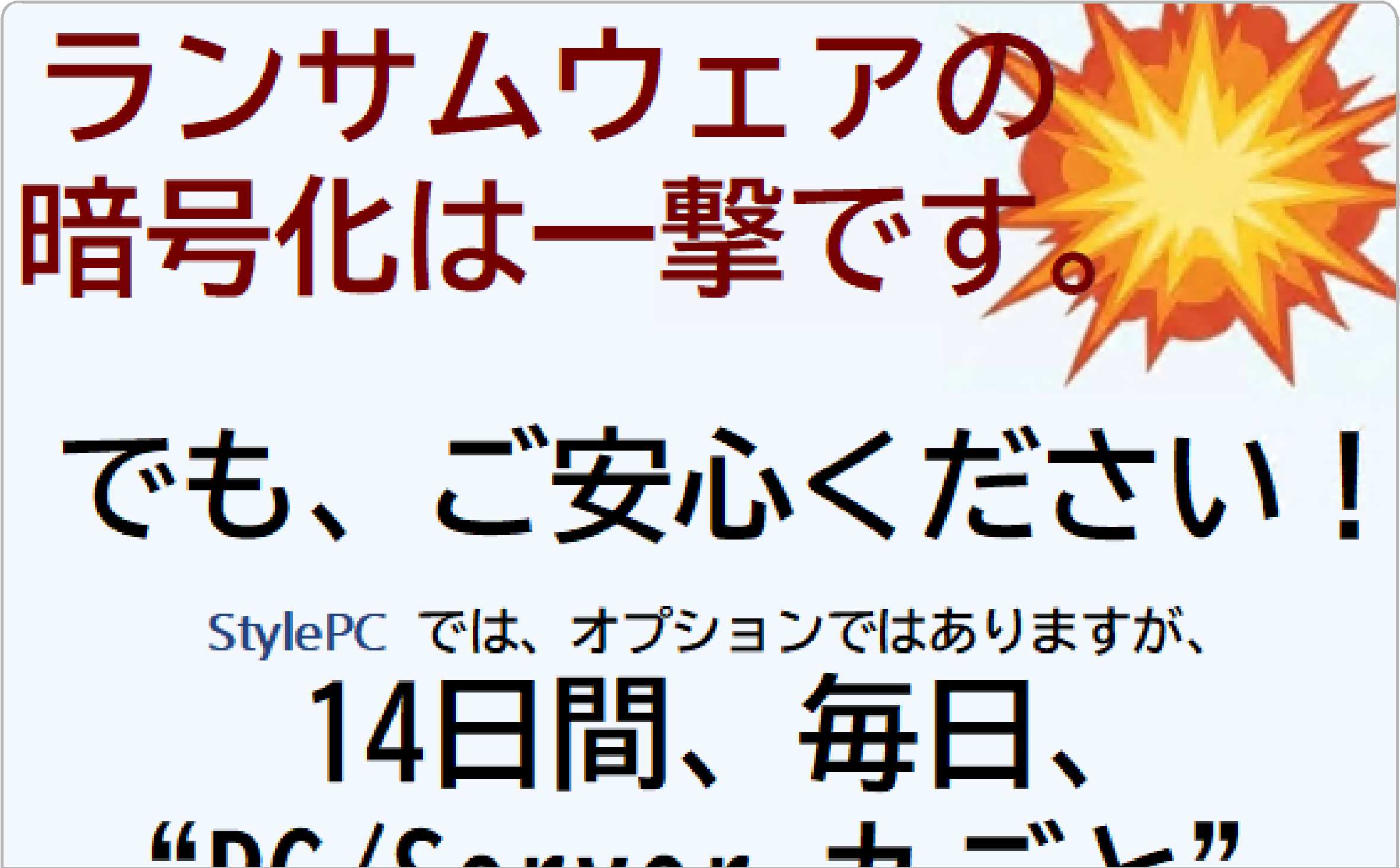 ランサムウェアの暗号化は一撃です。 でも、ご安心ください! StylePC では、オプションではありますが、直近14日間、毎日、“Windows丸ごと”をバックアップしています。 もしランサムウェアで暗号化されても、一日一日遡りながら正常だった最新日を特定。