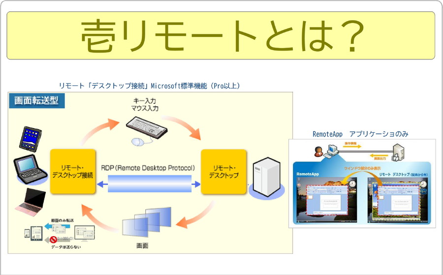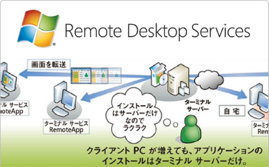 ①例え「100人」でもWinPCは「1台」のみでOKだからリーズナブルに運用可能②1度インストールするだけで皆がそのソフトウェアを同時に利用できてラクラク③1台のWinPCに皆で同時にログオン ●RemoteDesktopServices という標準機能