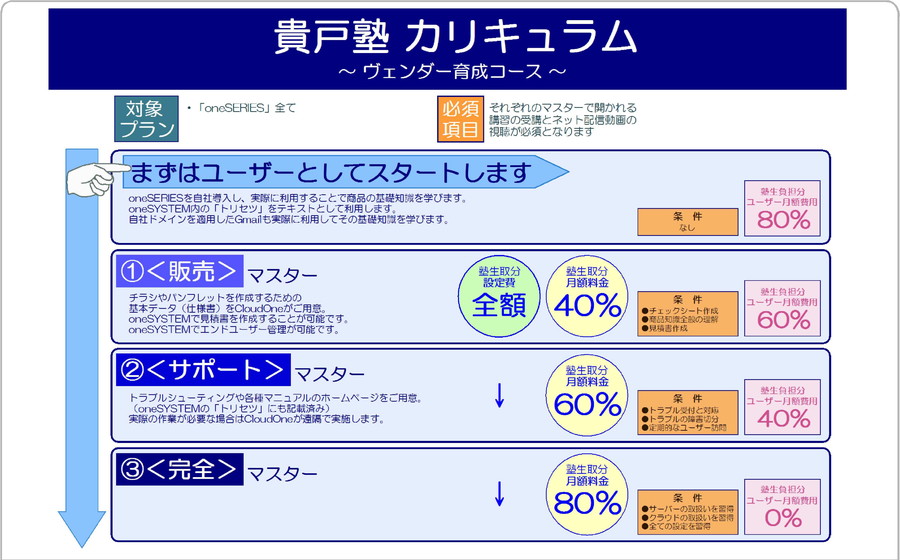 塾生の皆さんには、ユーザーとしての体験、特にユーザーになったばかりの頃の体験を大切にして欲しいのです。確かにわざわざユーザーにならなくとも、oneCLOUDの知識習得や販売活動に特に問題はないようにも思えますし、ユーザーになるということは、CloudStyleに対して月