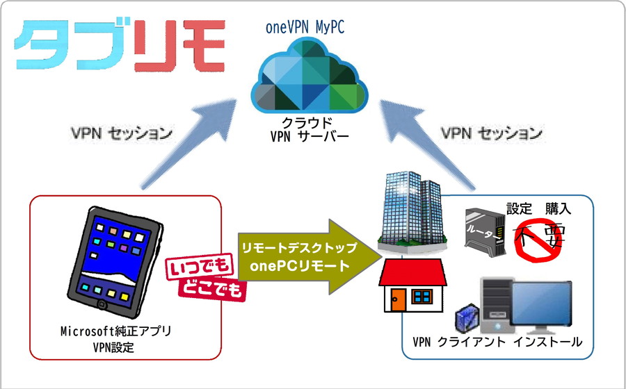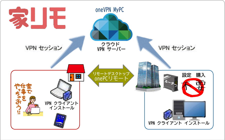 ①自席PC/他席PC のリモート操作で リモートワーク/モバイルワーク がすぐさま実現②ルーターに穴を空けることなく「ソフトVPN MyPC」で出先から自宅から安全接続③iOS/Android からササっと 自席PC/他席PC を出先でリモート操作 Macでも