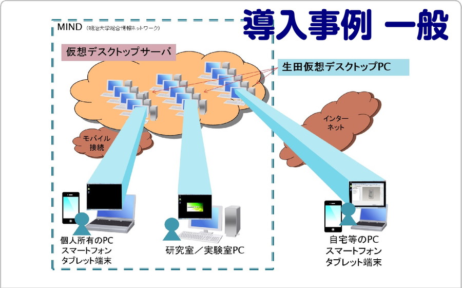 ●明治大学生田キャンパスの情報処理教室PCにインストールされているアプリケーションのほとんどを、研究室のPC、自宅等のPC、スマートフォン、タブレット端末等から(BYODもOK)ネットワークを経由して遠隔利用可能●明治大学生田キャンパスだけでなく、全キャンパスの教