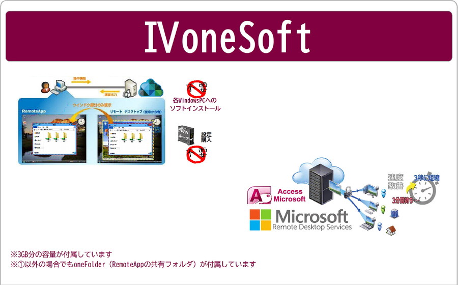 ①Windows10相当環境なのにActive Directoryが不要②面倒なアプリケーションの配置と登録が不要③Windows7相当でも高速RDP④oneCONNECTで簡単登録簡単接続⑤クラサバOffice Accessからの移行であれば高速化を約束⑥↑2U(up to you)適用