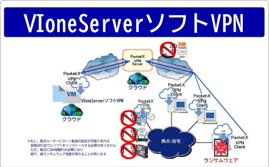①以下ⅰⅱⅲⅳ無しでクラウドサーバーを 拠点/自宅 利用可 ⅰVPNルーター ⅱ既存ルーターポート転送 ⅲ24H稼働PC ⅳ月額保守料②各拠点PC ⅰにソフトをインストール ⅱがランサムウェアに感染してもクラウドサーバーが暗号化の標的となる可能性は低い